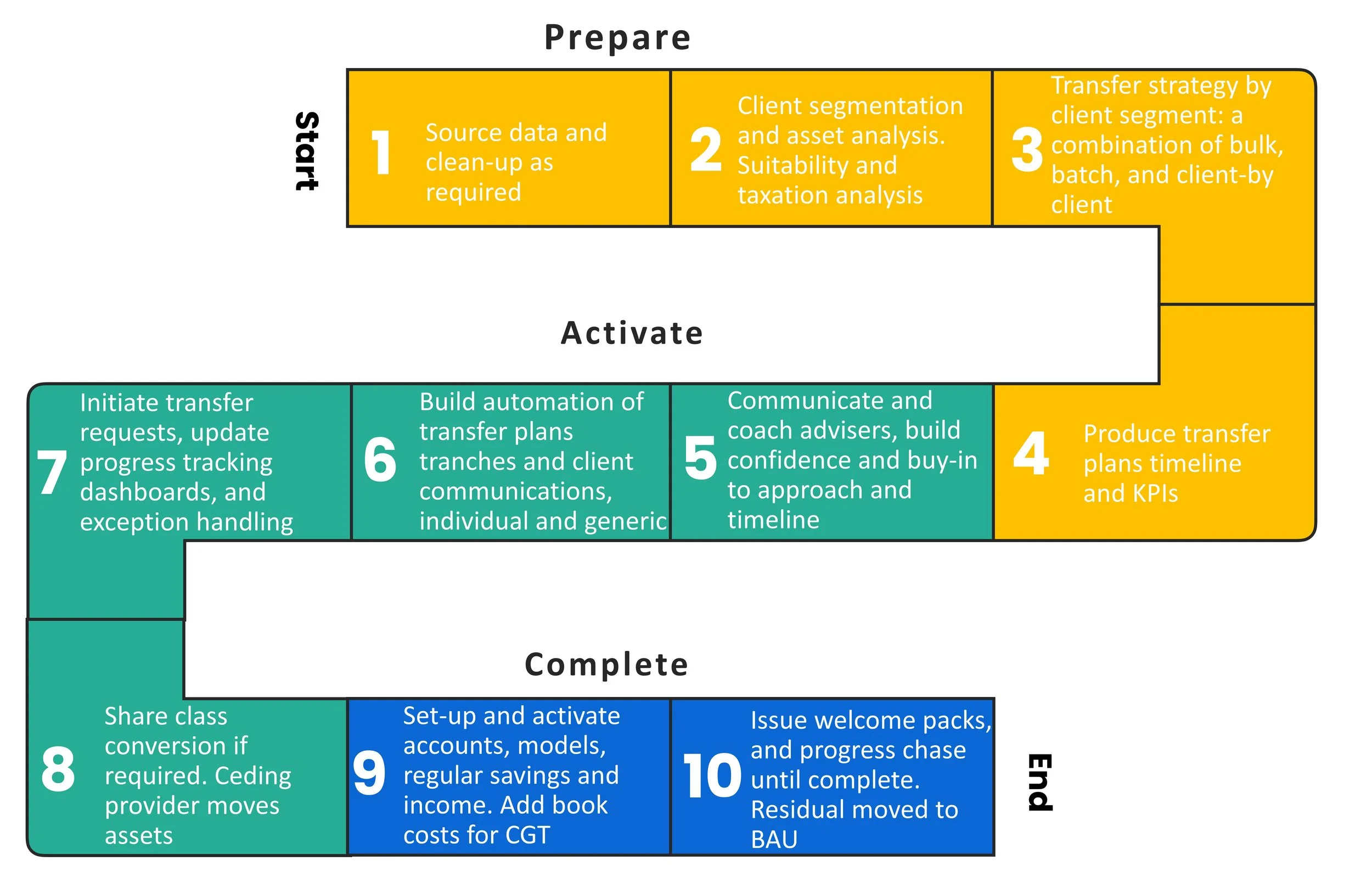 The following diagram shows the end-to-end transfer process covering Prepare, Activate, and Complete. Those readers familiar with Scaled Agile will spot that we have used the SAFe Implementation Framework as a template to build a ten-step summary of a well-trodden path. The steps that sometimes don’t get the attention they deserve are: